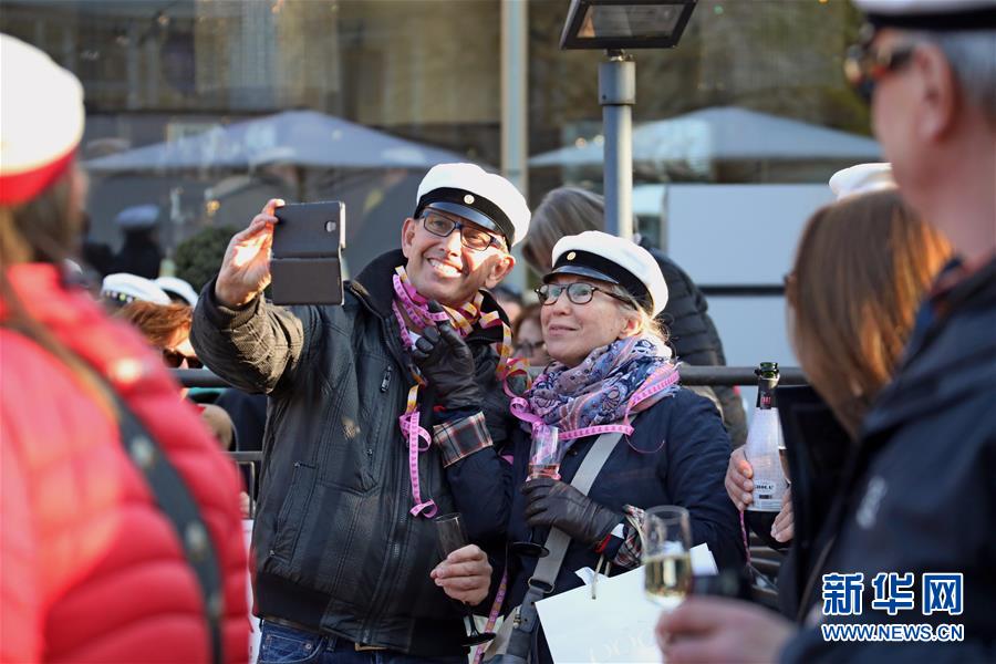 4月30日,在芬兰首都赫尔辛基市中心,人们头戴学生帽自拍留念。 当日,赫尔辛基举行一年一度的戴帽仪式,人们在吊车的帮助下为市中心圆形水池内的少女阿曼达塑像戴上帽子,并聚集在塑像周围尽情狂欢。 新华社记者李骥志摄