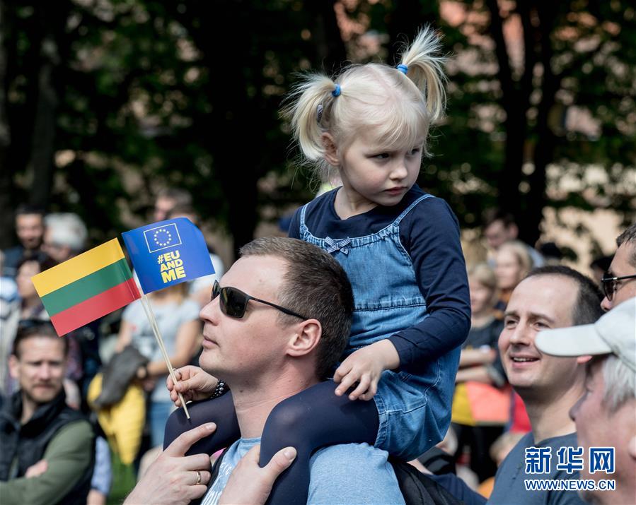 5月1日,在立陶宛首都维尔纽斯,人们参加纪念活动。 当日,立陶宛举行活动纪念加入欧盟15周年。 新华社发(阿尔弗雷达斯·普里亚迪斯摄)