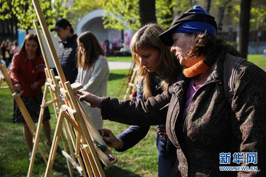 5月1日,在俄罗斯首都莫斯科,人们在公园作画,庆祝“五一”国际劳动节。 新华社发(马克西姆·切尔纳夫斯基摄)