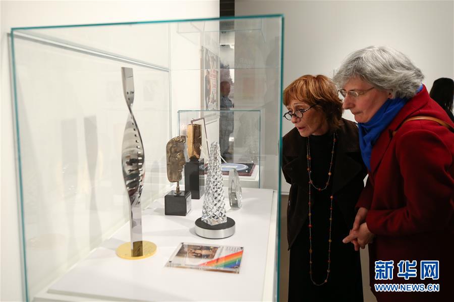 5月1日,在比利时布鲁塞尔,观众在“亲爱的奥黛丽”展览上参观奥黛丽·赫本获得的奖杯。新华社记者 张铖 摄