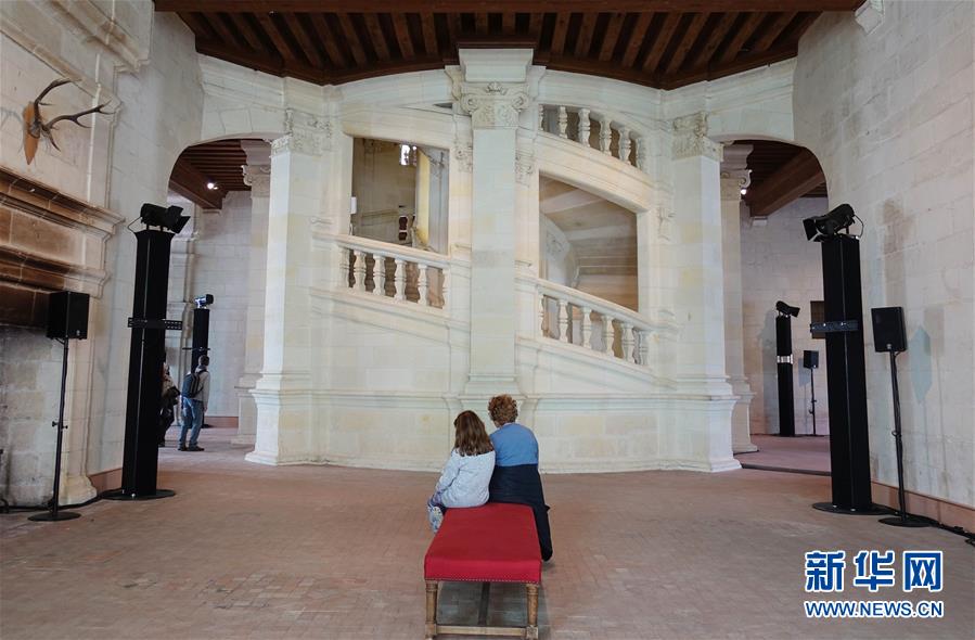 5月1日,游客在法国卢瓦尔河谷地区的香波堡参观据称来自达·芬奇构思的双螺旋楼梯。 新华社记者 高静 摄