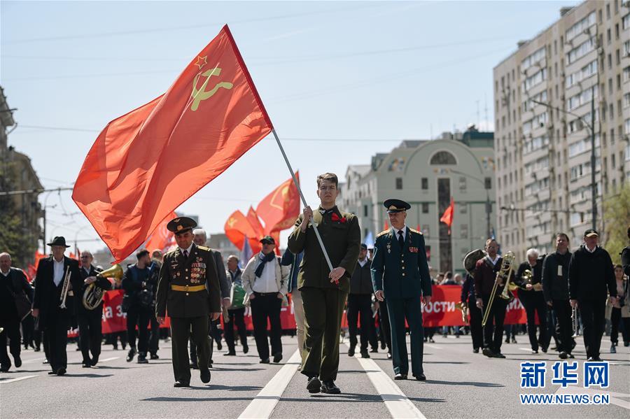 5月1日,在俄罗斯首都莫斯科,人们参加“五一”游行,庆祝“五一”国际劳动节。 新华社发(叶甫盖尼·西尼岑摄)
