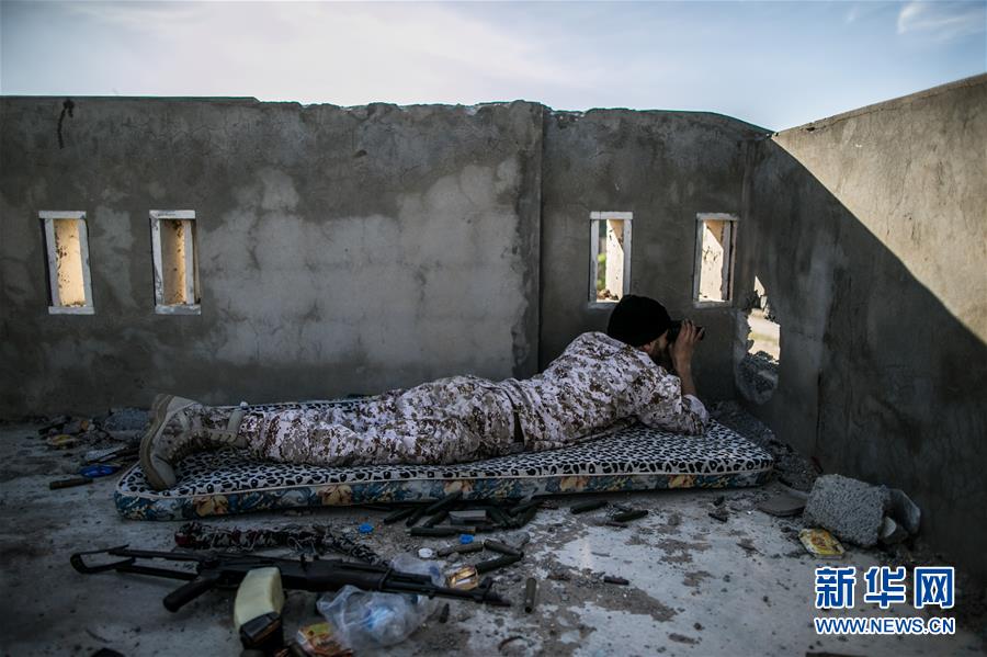 5月2日,在利比亚首都的黎波里南部,民族团结政府军队成员在掩体后观察“国民军”武装动向。