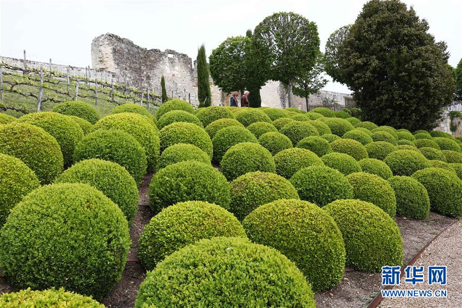 这是5月1日在法国昂布瓦兹的皇家城堡花园里拍摄的修剪成球形的树木。