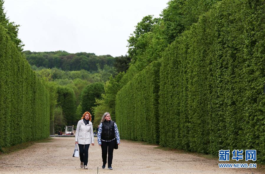 4月25日,在法国巴黎近郊的凡尔赛宫花园,游客走过修剪整齐的树木。
