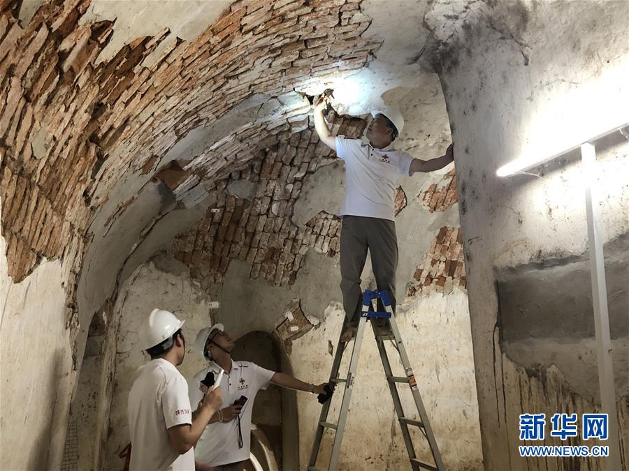 5月2日,在缅甸蒲甘,中国专家在监测他冰瑜佛塔内部的裂缝和变形情况。新华社记者 庄北宁 摄