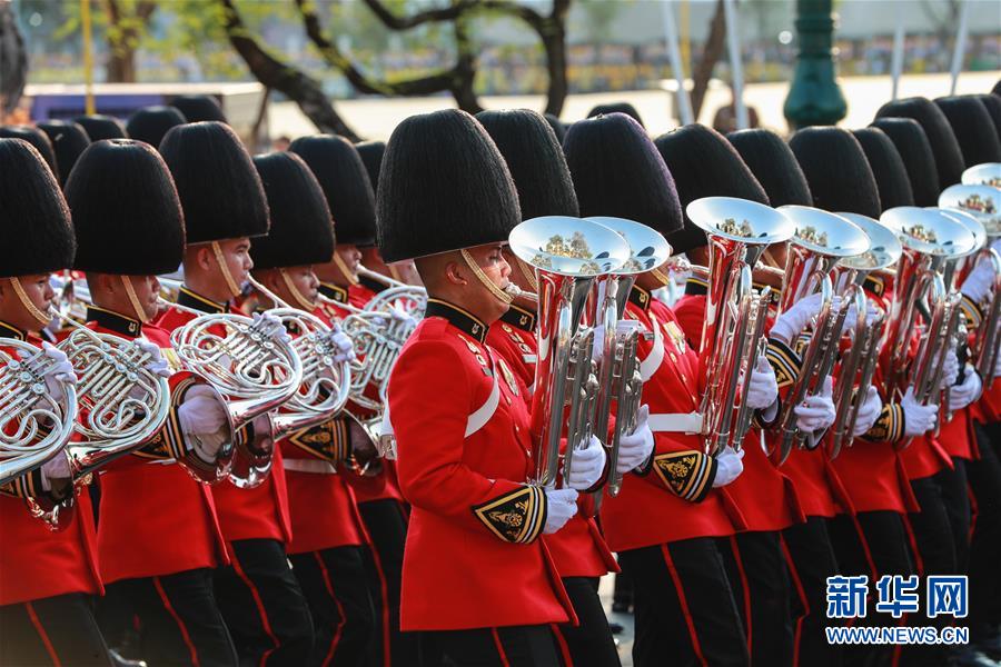 5月5日,仪仗队在曼谷大王宫附近举行的泰国国王加冕典礼巡游上列队前进。 新华社记者 张可任 摄