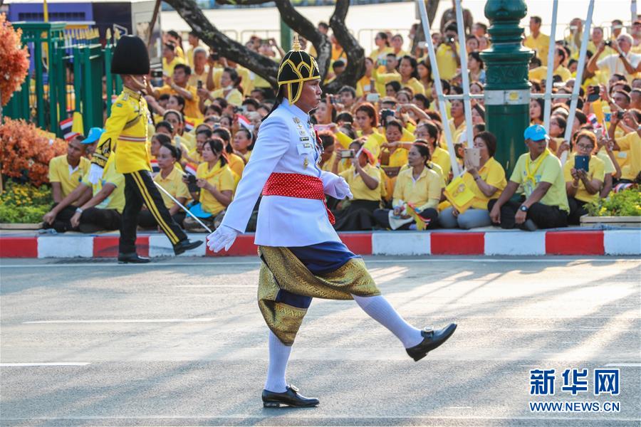 5月5日,仪仗队在曼谷大王宫附近举行的泰国国王加冕典礼巡游上列队前进。 新华社记者 张可任 摄
