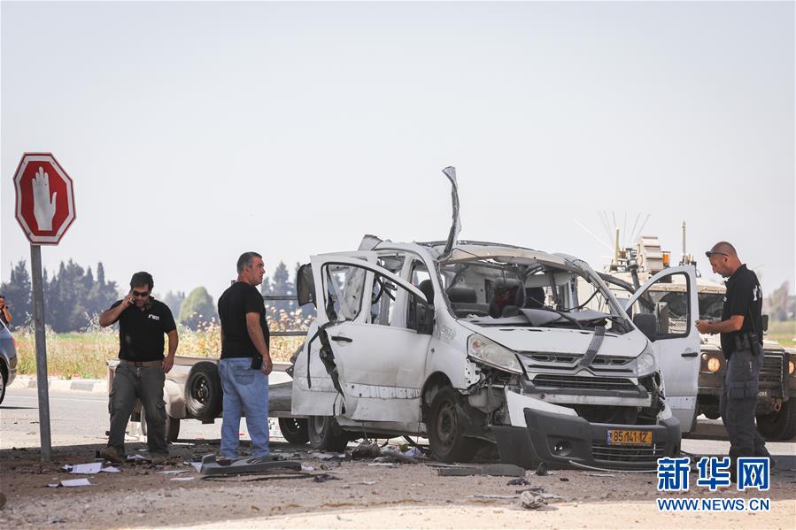 5月5日,在以色列南部的亚德莫迪凯附近,人们站在遭巴方火箭弹袭击损毁的汽车旁。 加沙地带巴勒斯坦武装组织与以色列军队冲突5日继续升级。冲突导致20多人丧生、逾200人受伤。 新华社/基尼图片社