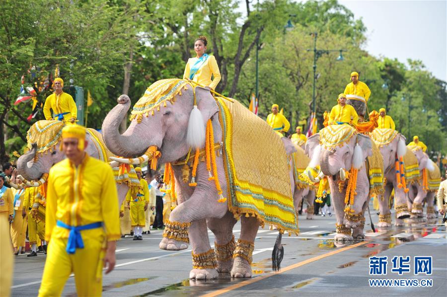 5月7日,在泰国曼谷,“白象”在驯象师的引领下前往大王宫。当日,10头来自泰国大城府被染色的大象在驯象师的引领下来到曼谷大王宫附近向国王画像行跪拜礼,以表尊敬。新华社发(拉亨 摄)