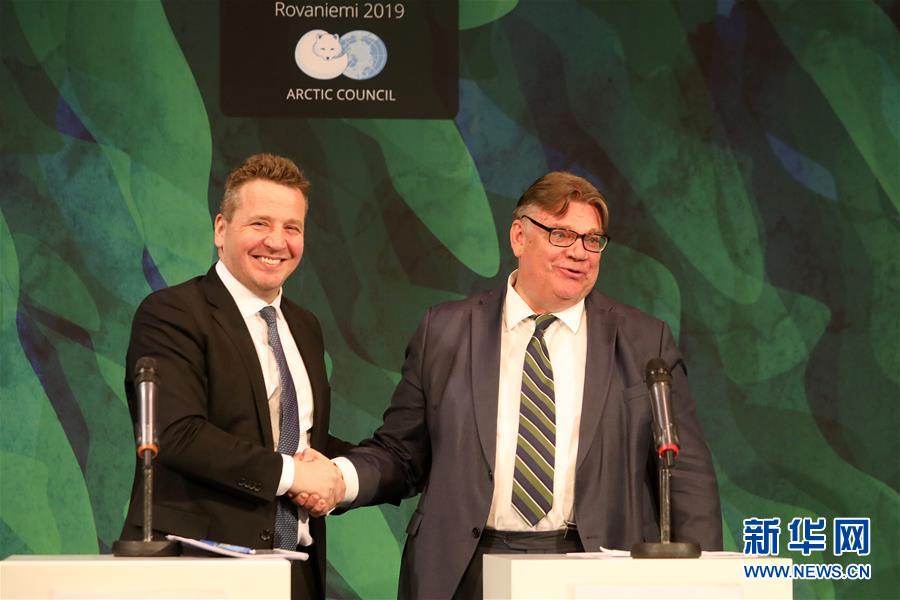 5月7日,在芬兰北部城市罗瓦涅米,冰岛外长索尔达松(左)与芬兰外长索伊尼共同举行记者会。 第11届北极理事会部长级会议7日在芬兰北部城市罗瓦涅米结束。由于美国的反对,本届会议未能发表共同宣言,这是北极理事会23年历史上首次出现这种情况。 新华社记者 李骥志 摄