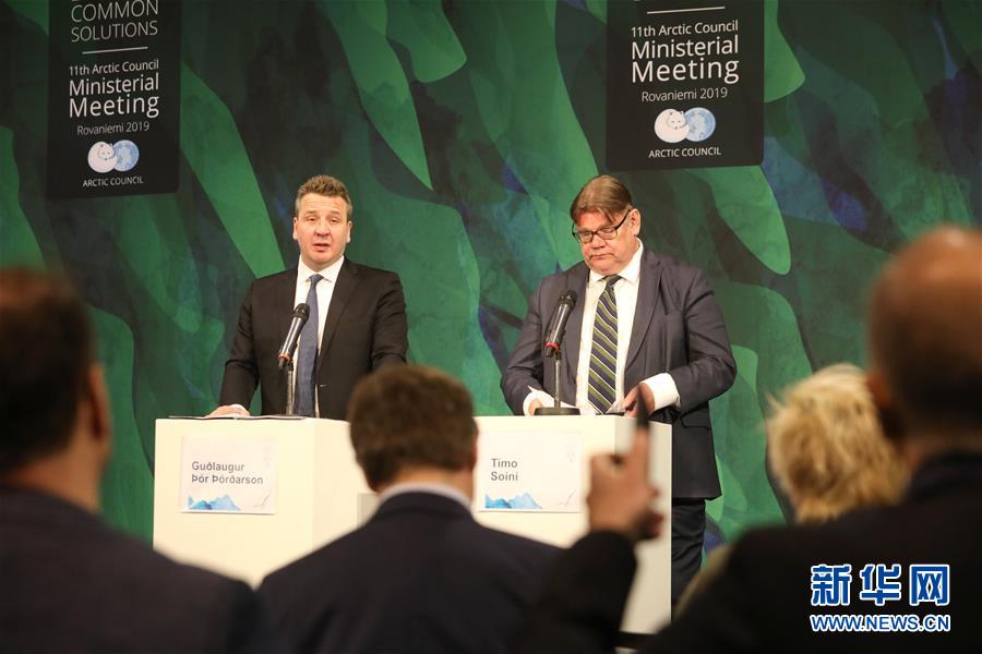 5月7日,在芬兰北部城市罗瓦涅米,冰岛外长索尔达松(左)与芬兰外长索伊尼共同举行记者会。第11届北极理事会部长级会议7日在芬兰北部城市罗瓦涅米结束。由于美国的反对,本届会议未能发表共同宣言,这是北极理事会23年历史上首次出现这种情况。新华社记者 李骥志 摄