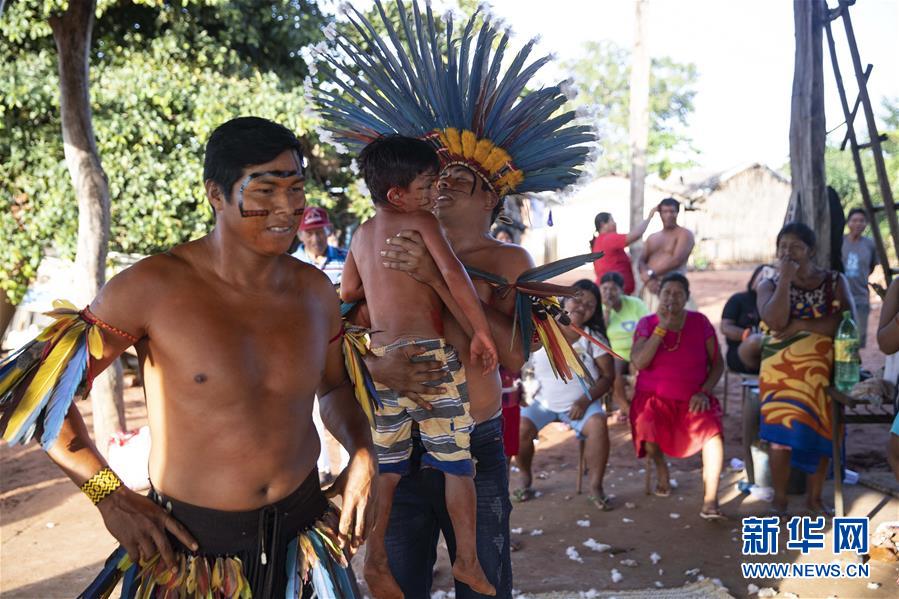 4月5日,在巴西马托格罗索州南部的雅鲁多里社区,雅鲁多里社区的酋长之子阿尼尔顿(前右)抱着儿子出席当地一种为孩子命名的仪式。 新华社记者李明摄