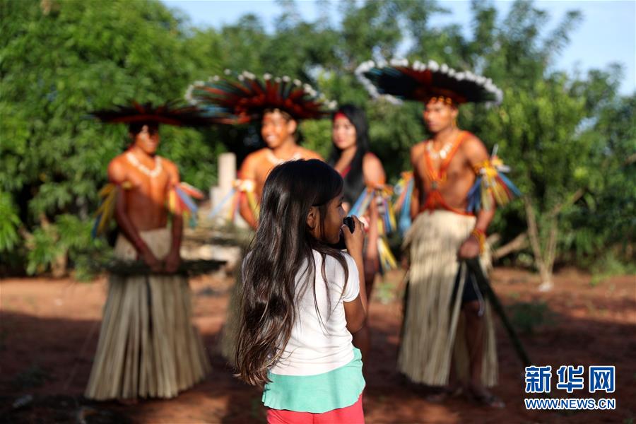 4月5日,在巴西马托格罗索州南部的雅鲁多里社区,一名女孩用手机为庆祝当地传统节日而装扮的大人们拍照。 新华社记者李明摄