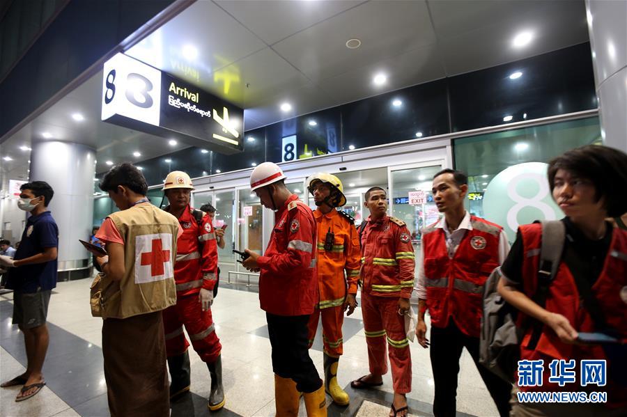 5月8日,救援人员聚集在缅甸仰光国际机场。 缅甸仰光国际机场警方8日向新华社记者证实,一架孟加拉国航空公司客机当天傍晚在仰光国际机场降落时滑出跑道,折成3段,造成包括机长在内多人受伤。 新华社发(吴昂摄)