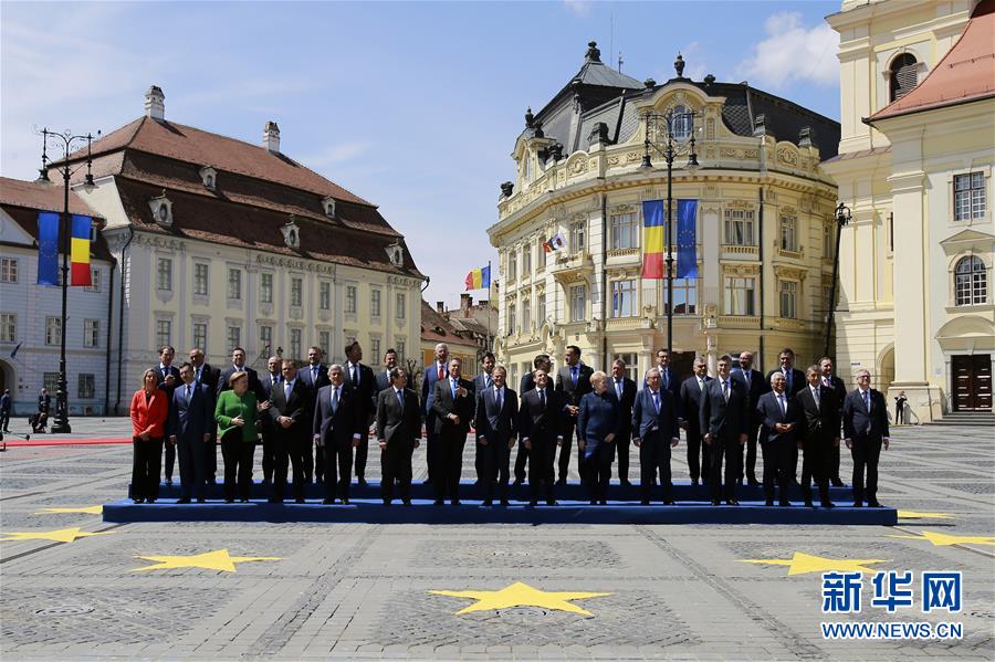 5月9日,在罗马尼亚锡比乌,与会成员在市政厅前的大广场合影。新华社发(克里斯泰尔摄)