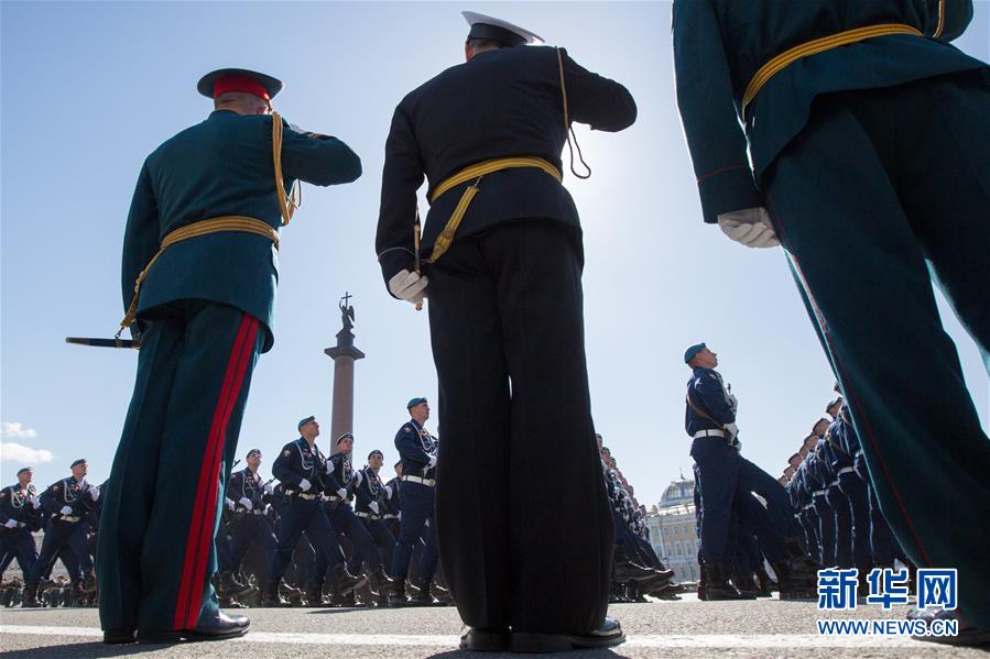 5月9日,在俄罗斯圣彼得堡举行的胜利日阅兵式上,军人列队通过冬宫广场,接受检阅。为庆祝卫国战争胜利74周年,俄罗斯圣彼得堡5月9日举行盛大阅兵式。新华社发(莫京娜 摄)