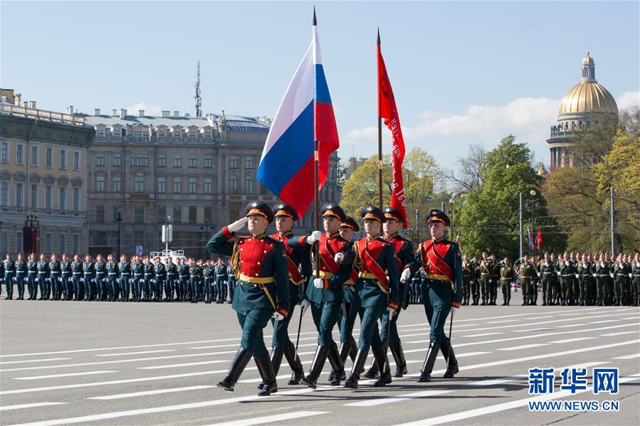 5月9日,在俄罗斯圣彼得堡举行的胜利日阅兵式上,军人护卫旗帜通过冬宫广场,接受检阅。为庆祝卫国战争胜利74周年,俄罗斯圣彼得堡5月9日举行盛大阅兵式。新华社发(莫京娜 摄)