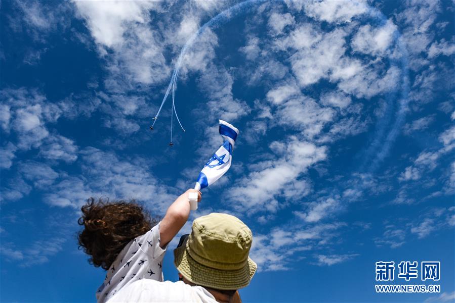5月9日,在以色列特拉维夫,人们观看飞行表演。 当日,以色列举行飞行表演,庆祝独立日。 新华社/基尼图片社