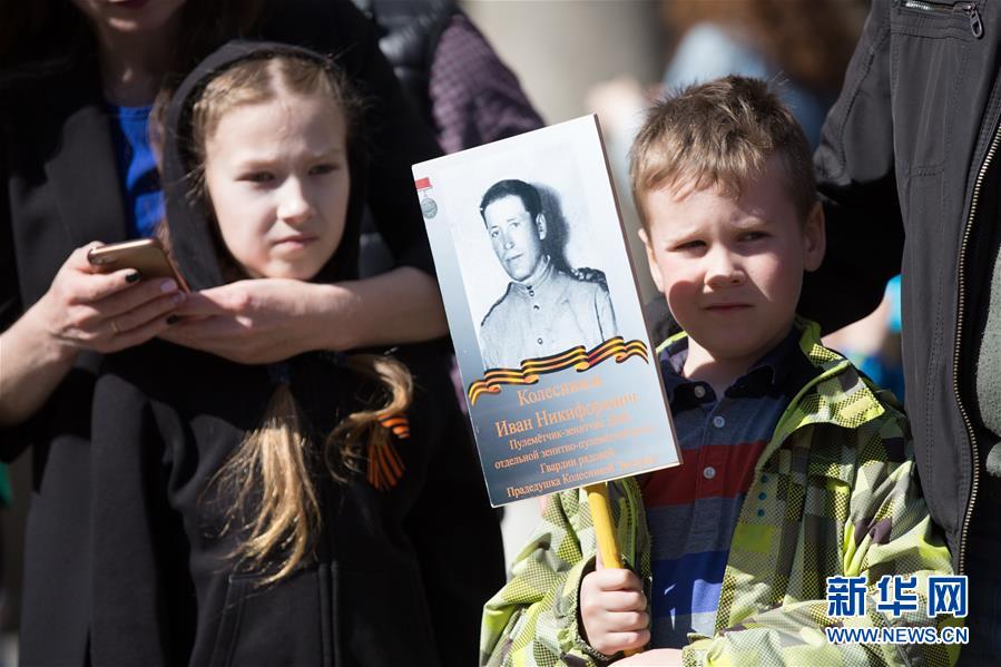 5月9日,在俄罗斯圣彼得堡,一名儿童手持老战士的照片参加“不朽军团”游行。 当日,圣彼得堡举行“不朽军团”游行,纪念卫国战争胜利74周年。 新华社发(莫京娜摄)