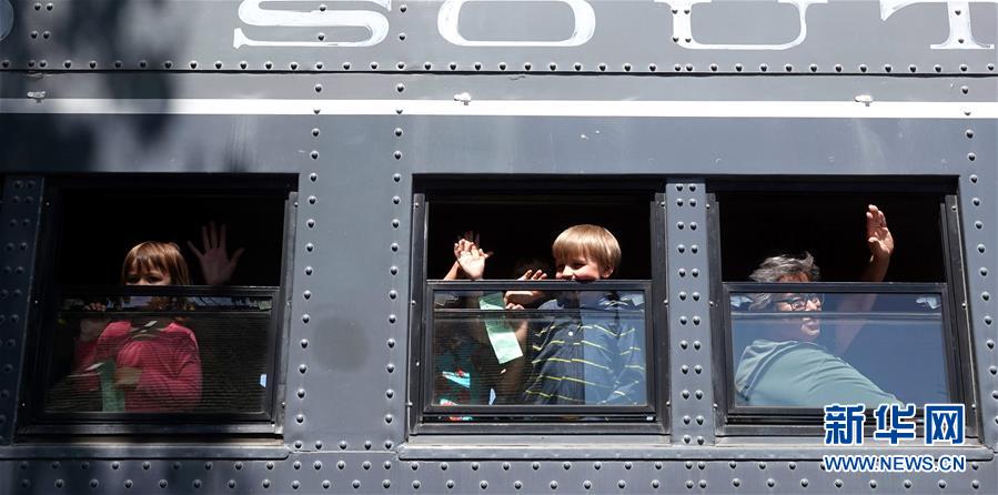 5月8日,在美国加利福尼亚州首府萨克拉门托,人们在纪念仪式后搭乘火车巡游。 当日,首条横跨美国大陆铁路竣工150周年纪念仪式在加州首府萨克拉门托老城举行。 新华社记者 吴晓凌 摄