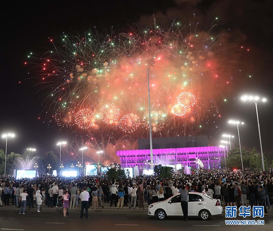 5月9日,乌兹别克斯坦在首都塔什干燃放烟花,庆祝二战胜利74周年。 新华社发(扎法尔摄)