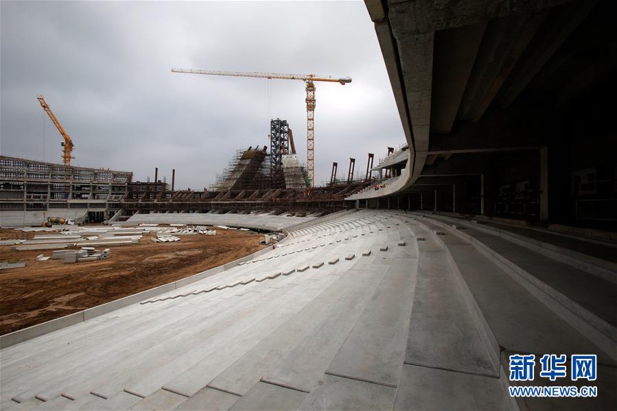 这是5月12日拍摄的柬埔寨国家体育场项目施工现场。 由中国政府援建的柬埔寨国家体育场项目主体结构12日在柬埔寨首都金边正式封顶。 新华社发(索万纳拉 摄)