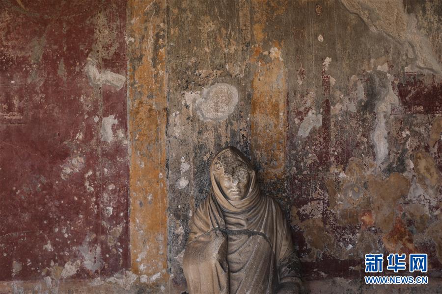 这是4月30日在意大利庞贝古城拍摄的一处雕塑。新华社记者 程婷婷 摄