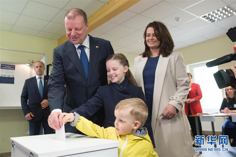 5月12日,在立陶宛首都维尔纽斯,立陶宛绿党和农民联盟提名的候选人、现任总理绍柳斯·斯克韦尔内利斯与家人在投票站投票。新华社发(阿尔弗雷达斯·普里亚迪斯摄)