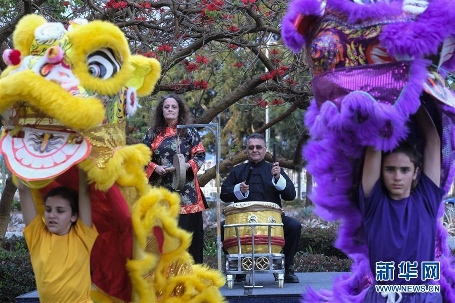 5月9日,在美国圣迭戈,阿布德一家人为来宾表演舞狮。 新华社发(赵汉荣 摄)