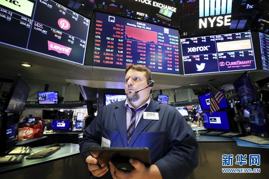 5月13日,交易员在美国纽约证券交易所工作。 纽约股市三大股指13日大幅下跌。截至当日收盘,道琼斯工业平均指数比前一交易日下跌617.38点,收于25324.99点,跌幅为2.38%。标准普尔500种股票指数下跌69.53点,收于2811.87点,跌幅为2.41%。纳斯达克综合指数下跌269.92点,收于7647.02点,跌幅为3.41%。 新华社记者王迎摄