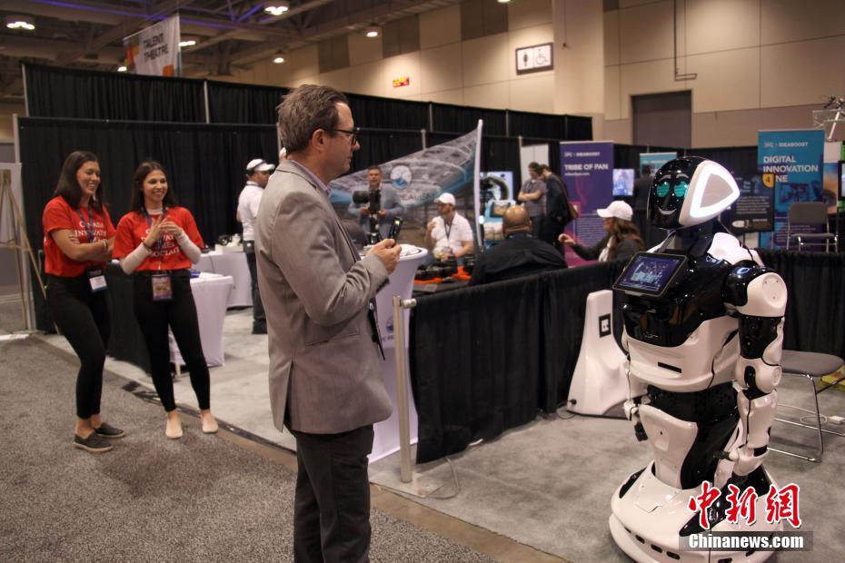 当地时间5月13日,在多伦多举行的“Discovery”创新展上,观众尝试与一个智能机器人进行对话。该创新展是加拿大创新领域规模最大和最具影响力的年度活动之一。中新社记者 余瑞冬 摄