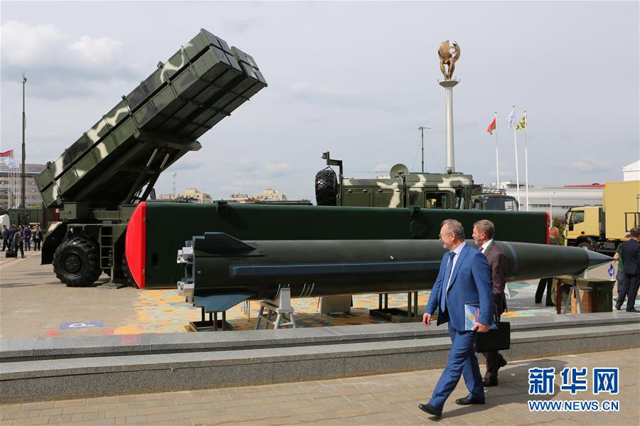 5月15日,在白俄罗斯首都明斯克,人们从一款防空武器前走过。 第九届白俄罗斯“米列克斯-2019”国际武器装备和军事技术展15日在白俄罗斯首都明斯克开幕。作为本届展会最大外国参展方之一,中国企业带来了“彩虹”系列无人机系统等军工产品。 新华社记者 魏忠杰 摄