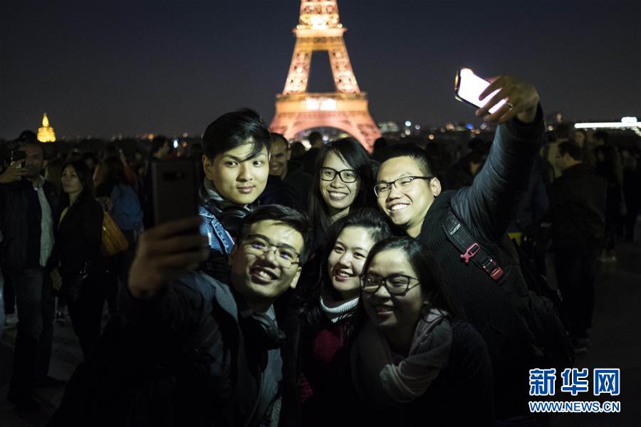 5月15日,在法国首都巴黎,游客们与正在进行声光秀的埃菲尔铁塔合影。 5月15日,法国巴黎埃菲尔铁塔举行声光秀,庆祝铁塔130岁生日。法国巴黎埃菲尔铁塔于1889年正式落成。 新华社发(亚历山大·卡曼摄)