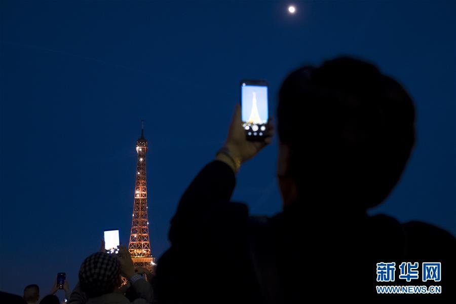 5月15日,在法国首都巴黎,一名游客观看埃菲尔铁塔声光秀。 5月15日,法国巴黎埃菲尔铁塔举行声光秀,庆祝铁塔130岁生日。法国巴黎埃菲尔铁塔于1889年正式落成。 新华社发(亚历山大·卡曼摄)