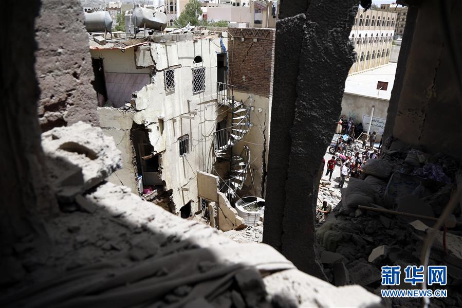 5月16日,在也门首都萨那,当地居民查看遭空袭的房屋。 也门胡塞武装16日说,沙特阿拉伯领导的多国联军当天对也门首都萨那实施密集空袭,造成至少6名平民死亡。 新华社发(穆罕默德 摄)