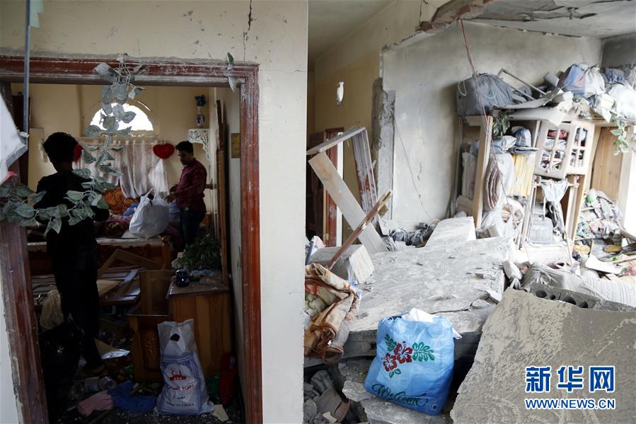5月16日,在也门首都萨那,当地居民收拾遭空袭的房屋。 也门胡塞武装16日说,沙特阿拉伯领导的多国联军当天对也门首都萨那实施密集空袭,造成至少6名平民死亡。 新华社发(穆罕默德 摄)