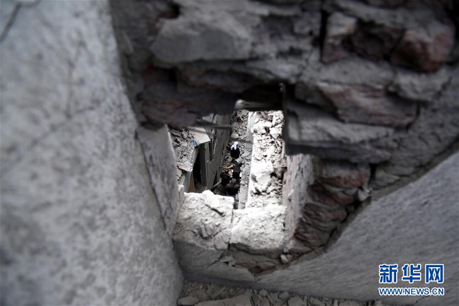 5月16日,在也门首都萨那,当地居民查看遭空袭的房屋。 也门胡塞武装16日说,沙特阿拉伯领导的多国联军当天对也门首都萨那实施密集空袭,造成至少6名平民死亡。 新华社发(穆罕默德 摄)