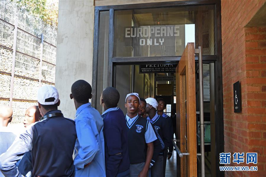 5月17日,在南非约翰内斯堡种族隔离博物馆内,一处门上写有“仅限欧洲人”的字样。 南非种族隔离博物馆于2001年建成并向公众开放。博物馆通过文字、图片、视频和上百件实物向每一位参观者揭露了南非种族隔离时期的黑暗,同时也展示了南非结束种族隔离政策以来,这个国家如何从“黑白分明”发展成“彩虹之国”。 新华社记者 陈诚 摄