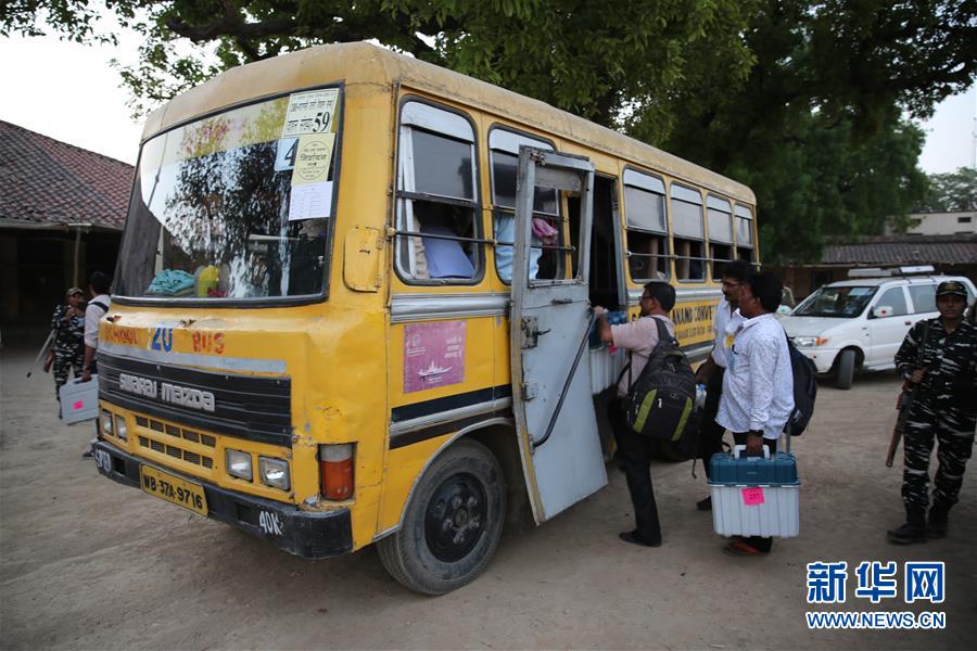 5月19日,在印度北方邦的瓦拉纳西的一处投票站外,工作人员携带装箱的电子投票系统准备乘公共汽车离开。 印度大选最后阶段投票于当地时间19日18时结束,这标志着2019年印度全国大选投票全部结束。 新华社记者赵旭摄