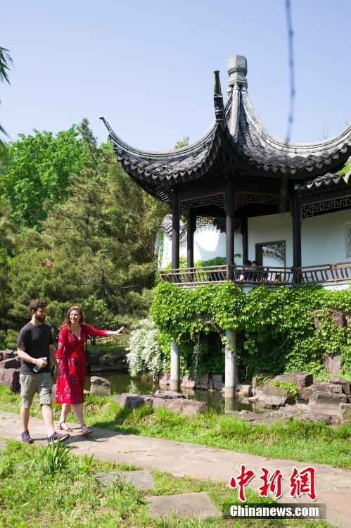 当地时间5月19日,游客在位于美国纽约斯塔滕岛的寄兴园内参观。该园占地面积约4000平方米,以中国园林设计家邹宫伍为主要设计师,仿照中国苏州园林设计建造而成。园林所用的建筑材料大都在苏州加工制造,并由40名来自苏州的艺术家和工匠历时6个月在纽约修建而成。寄兴园于1999年6月正式开放,每年吸引众多游客前来体验中国园林之美。中新社记者 廖攀 摄