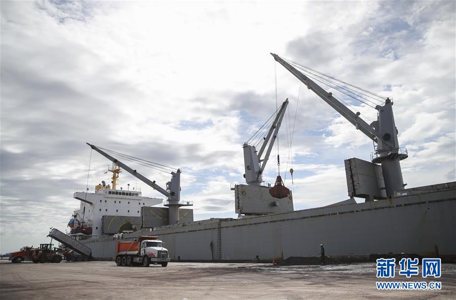 在美国南路易斯安那港,货船在装运货物(2月27日摄)。 新华社记者 王迎 摄