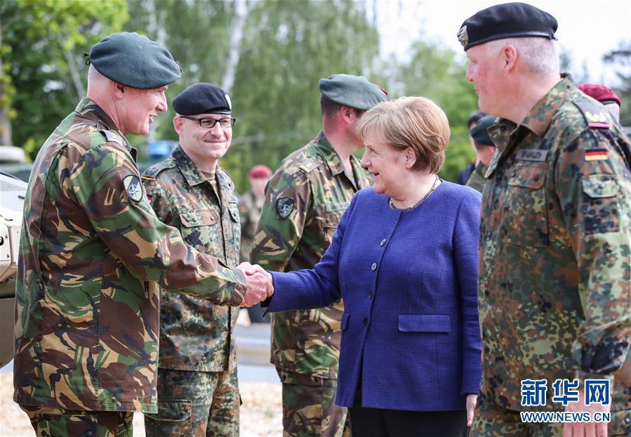 5月20日,在德国蒙斯特,德国总理默克尔(右二)与北约快速反应部队成员握手。 当日,德国总理默克尔在德国北部城市蒙斯特视察驻当地北约快速反应部队。约400名军人以及战机、直升机、坦克、装甲车等参与演示。 新华社记者单宇琦摄