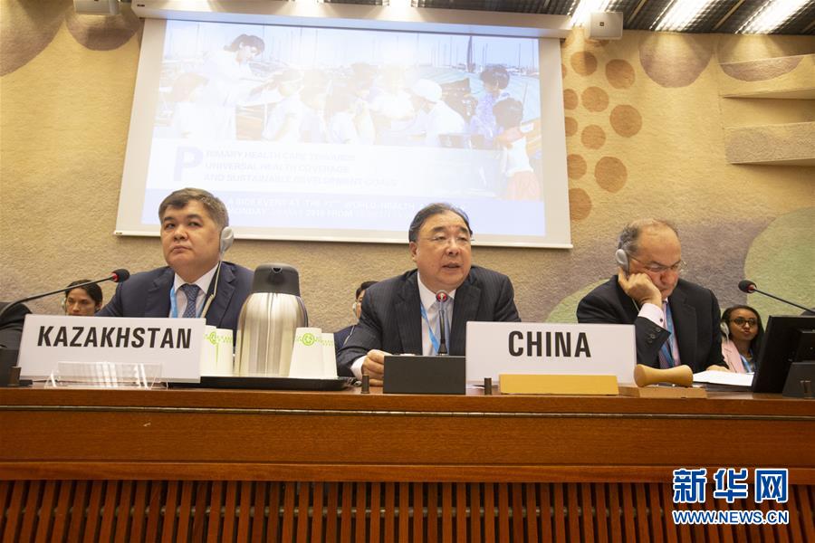 5月20日,在位于瑞士日内瓦的联合国万国宫,中国国家卫生健康委员会主任马晓伟(中)出席“从初级卫生保健迈向全民健康覆盖和可持续发展目标”主题边会并做主旨发言。 第72届世界卫生大会20日开幕,中国等五国当天在日内瓦共同举办“从初级卫生保健迈向全民健康覆盖和可持续发展目标”主题边会,中国国家卫生健康委员会主任马晓伟出席并做主旨发言。 新华社记者 徐金泉 摄