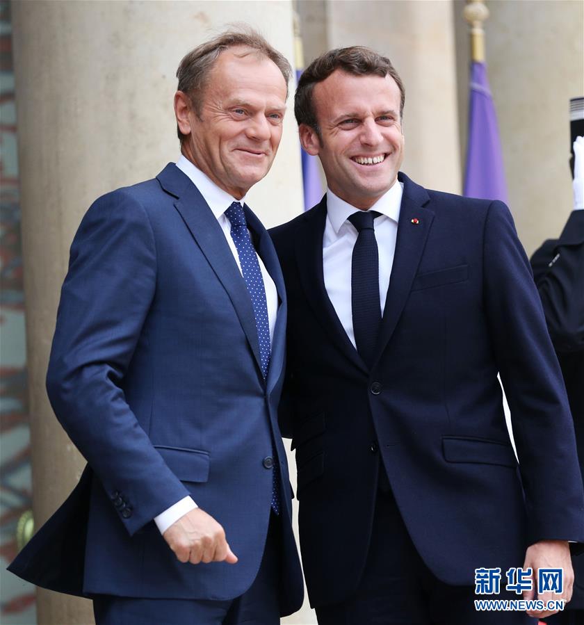 5月20日,在法国巴黎总统府爱丽舍宫,法国总统马克龙(右)迎接来访的欧洲理事会主席图斯克。 新华社记者高静摄