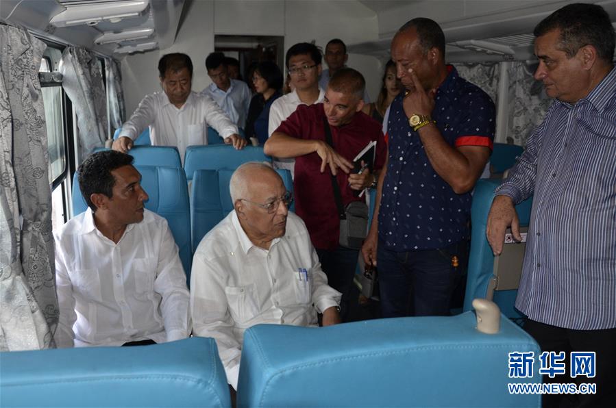 5月20日,在古巴哈瓦那港,古巴部长会议副主席里卡多·卡夫里萨斯(前左二)参观中国铁路客车并试坐座椅。 新华社发(华金·埃尔南德斯摄)