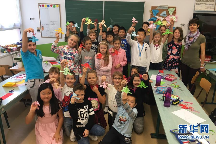 在匈牙利首都布达佩斯,匈中双语学校的学生在中国国庆节活动日上展示“春”字剪纸(资料照片,2017年9月29日摄)。 位于匈牙利首都布达佩斯第15区的匈中双语学校是中东欧唯一同时使用当地语言和中文教学的全日制公立学校。从以中国学生为主到匈牙利学生占绝大多数,匈中双语学校创立十五年来的学生结构变化,显示出中文和中国在匈牙利日益受到重视。 (配本社同题文字稿) 新华社发(匈中双语学校供图)