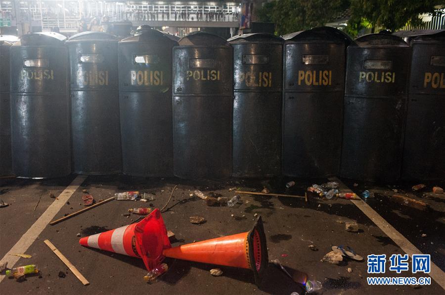 5月22日,在印度尼西亚首都雅加达,警察在选举监督机构外执勤。 印度尼西亚警方22日说,印尼首都雅加达个别地区21日晚和22日凌晨发生因对选举结果不满引发的骚乱,警方已经逮捕了69名嫌疑人。 新华社发(维里摄)