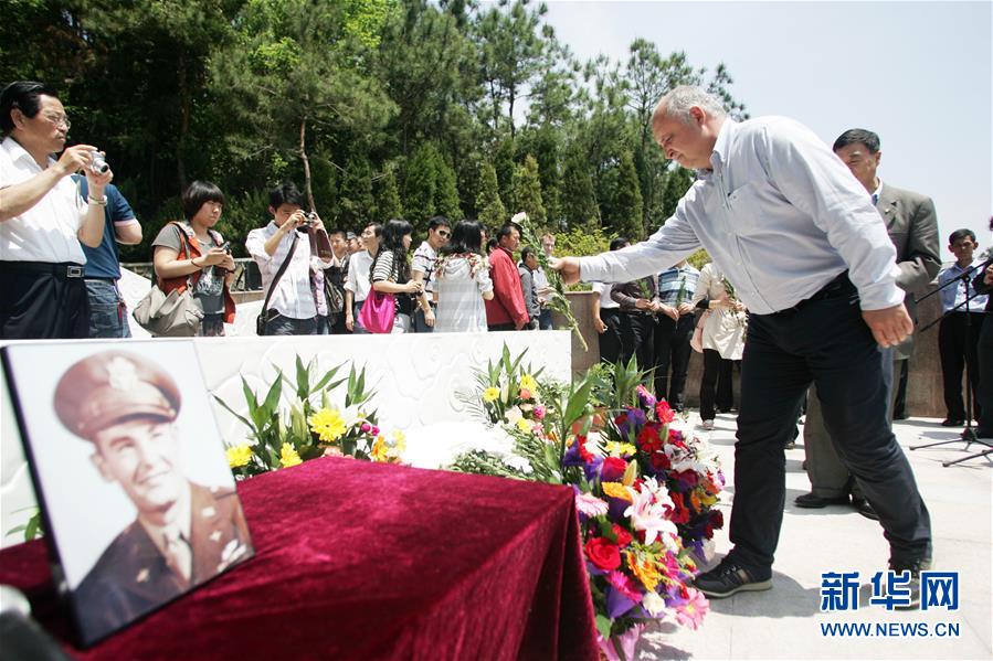 在中国湖北省红安县李先念故居纪念园,人们参加美国“飞虎队”老兵格伦·本尼达的骨灰安葬仪式(资料照片,2011年5月11日摄)。 望着湖水里的战机残骸,81岁的美国“飞虎队”老兵格伦·本尼达再难控制自己的感情,泪水涌出眼眶。在他的身边,簇拥着湖北省监利县的村民们。得知“飞虎队”老英雄回来了,人们奔走相告,敲锣打鼓,给予格伦热烈的欢迎。 这是纪录片《飞虎情缘》的一个片段,展现的是2005年格伦重返中国时的场景。5月早些时候,中美航空遗产基金会在美国拉斯维加斯举办了“飞虎队”历史论坛,8名“飞虎队”老兵和约30名亲属应邀出席。格伦·本尼达的长子爱德华·本尼达专门播放了这部纪录片。新华社发