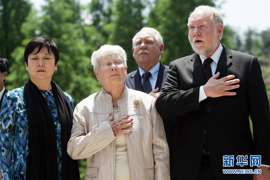 在中国湖北省红安县李先念故居纪念园,美国“飞虎队”老兵格伦·本尼达的妻子埃莉诺·本尼达(左二)、儿子爱德华·本尼达(右二)和亨利·本尼达(右一)参加格伦·本尼达的骨灰安葬仪式(资料照片,2011年5月11日摄)。 望着湖水里的战机残骸,81岁的美国“飞虎队”老兵格伦·本尼达再难控制自己的感情,泪水涌出眼眶。在他的身边,簇拥着湖北省监利县的村民们。得知“飞虎队”老英雄回来了,人们奔走相告,敲锣打鼓,给予格伦热烈的欢迎。 这是纪录片《飞虎情缘》的一个片段,展现的是2005年格伦重返中国时的场景。5月早些时候,中美航空遗产基金会在美国拉斯维加斯举办了“飞虎队”历史论坛,8名“飞虎队”老兵和约30名亲属应邀出席。格伦·本尼达的长子爱德华·本尼达专门播放了这部纪录片。新华社发